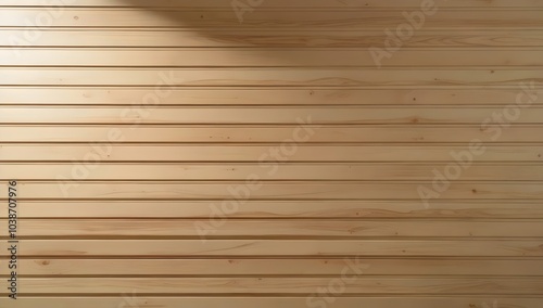 Horizontal wooden planks with smooth finish and soft, warm lighting, creating a pattern of alternating light and shadow for design purposes.