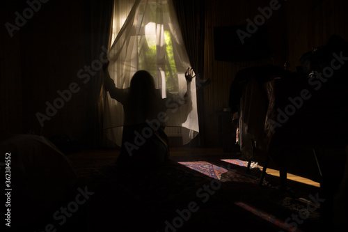 ghost, skittish, room, devil, background, fear, evil, night, halloween, scarey, horror, dark, black, nightmare, daemon, monster, dead, darkness, danger, shadow, thriller, abstract, death, murder, sorcerer, woman, creepy, haunted, house, mysterious, mystery, fright, girl, afraid, fantasy, bedchamber, bed, curtain, grim, reaper, zombie, maniac, dramatic, motion picture, cinema, person, silhouette, scene, light, fire