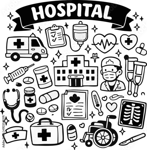 hospital, medicals, health care, icon, symbol, cross, ambulance, doctor, nurse, medicine, pharmacy, prescription, patient, care, health, clinic, emergency, aid, first, syringe, stethoscope, wheelchair, x-ray, nubes, heartbeat, chart, clipboard, file, record