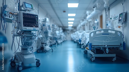 Hospital ward equipped with automated beds and patient monitoring devices, showcasing healthcare technology innovations in patient care