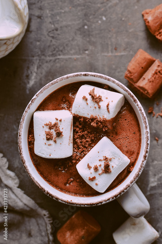 Hot chocolate and marshmallows. Hot Cocoa in a white cup. Dark background. Copy space. Steam from a cup. Top view