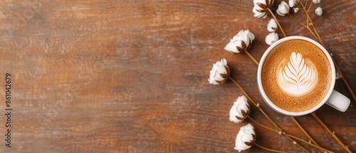 Hot latte art coffee on a rustic wooden table, surrounded by a few branches of cotton, creating a cozy and warm atmosphere.