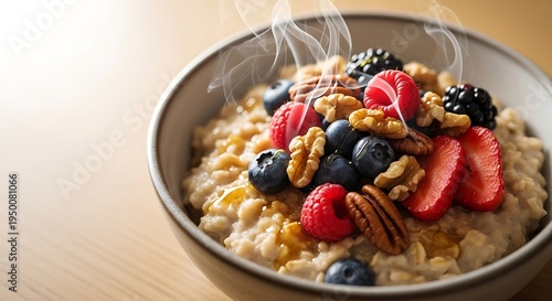 Hot Oatmeal Bowl with Fresh Berries and Nuts Delicious Breakfast