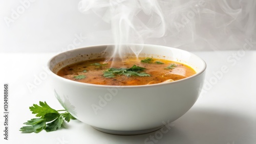 soup, bowl, steam, hot, food, culinary, dish, cookery, meal, eat, eating, white, background, isolated, studio, photo, garnish, parsley, herb, healthy, comfort, warmth, delicious, appetising, texture, colours, vibrant, aroma, fragrance, steamy, cooking, receipe, ingredient, image, visual, graphic, element, object, epicure