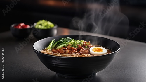 ramen, noodle, broth, pork meat, egg, bok choy, vegetable, spicey, asian, japanese, food, dish, meal, cookery, eatery, delicious, tasty, hot, steaming, soup, comfort, bowl, healthy, protein, carb, dinner, lunch, flavorful, appetising, quick, easy, ready, eat, japanese food, asian cuisine, fast food, health food, take-out, homemade, delivery, epicure