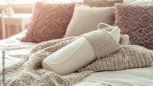 Hot water bottle resting on a cozy bed, providing warmth and comfort during cold nights. Embracing the simple pleasures of home and relaxation