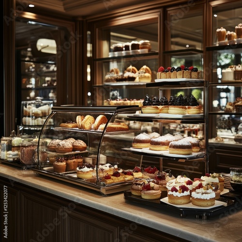 Hotel bakery pastries display, breakfast buffet, delicious sweets, luxury hotel