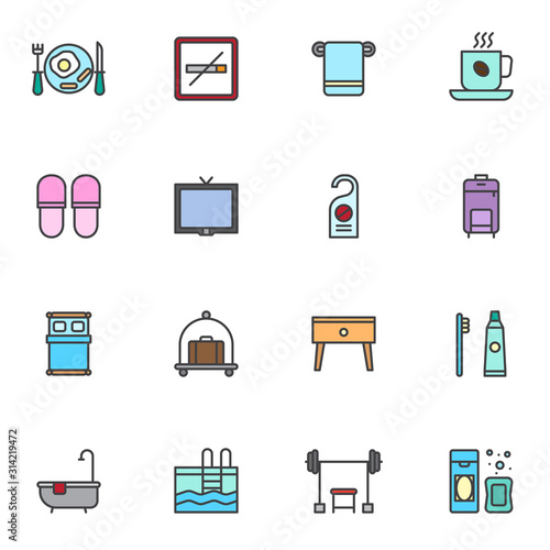 hotel, filled, icon, set, collection, pack, line, stroke, outline, colours, colourful, linear, vector, logotype, pictogram, flat, symbol, signs, web, design, illustration, single, editable, graphic, pixel, honed, breakfast, baggage, cart, television, shower, gym, swimming, pool, door, hanger, bed, double, room, slipper, towel, hot drink, smoking, toothbrush, maid, television, service, bathe, motel, tags