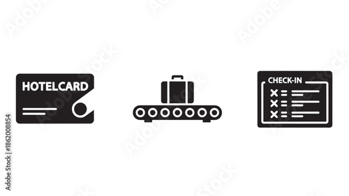 Hotel Icons Set in Simple Monochrome Design with White Graphics on Black Background for Travel Website
