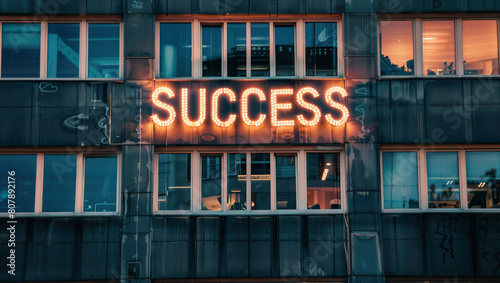 House facade in a city with the illuminated sign "SUCCESS"