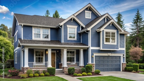 House Front View with Two Stories Blue Gray Siding, vinyl siding, rustic charm
