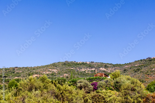 House in hillside landscape with blue sky France Corsica 18 June 2025
