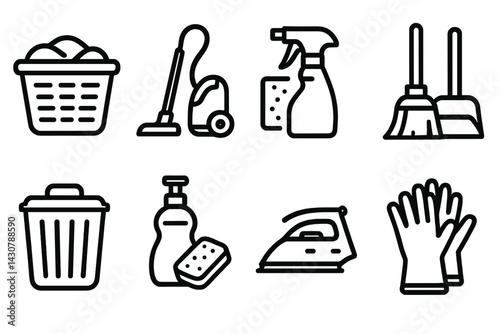 Household cleaning tasks are symbolized by icons such as laundry, vacuum, spray, broom, trash, dishes, iron, and gloves