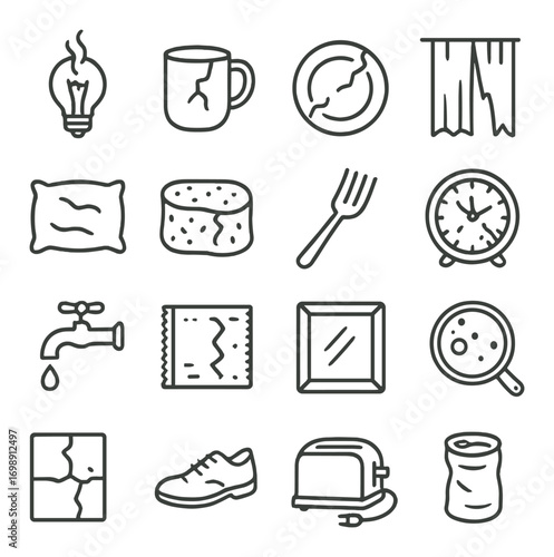 household, item, linear, icon, set, light, bulb, mug, plate, curtain, pillow, sponge, fork, clock, icon, faucet, towel, mirror, magnifying, glasses, cracked, repair, utensil, decor, broken, drip, droplet, kitchen, domestic, home, essential, vector, outline, everyday, cleaning, utensil, alarm, crockery, textile, magnifier, damage, liquid, laundered, tool, vintage, appliance