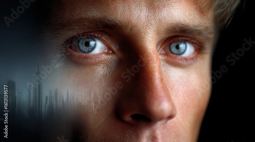housing crisis, American dream, Close-up of a man"s blue eyes and part of his face with a city skyline subtly reflected on the left side, blending human detail with urban elements.