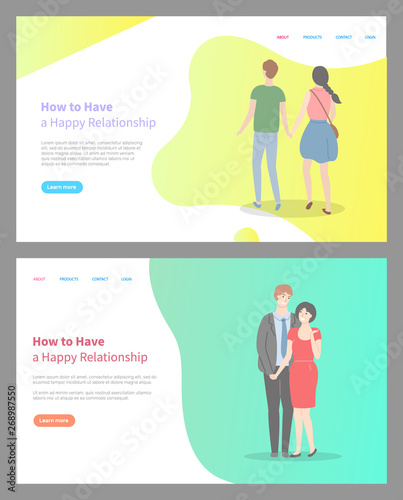 How to build happy relationship vector, couples walking together, man and woman in love spending time together. Female and male cuddling embracing. Website or webpage template, landing page flat style