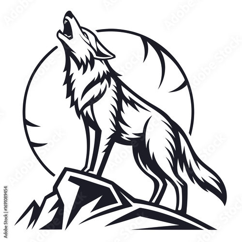 Howling Wolf on Cliff with Moon - Vector Illustration.
