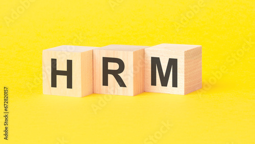 HRM - HUMAN RESOURCE MANAGEMENT symbol. wooden cubes with words. beautiful yellow background. business concept. copy space.