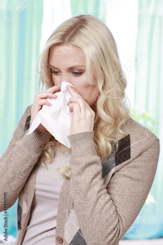 Hübsche Frau mit Schnupfen und Taschentuch