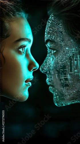 ai, artificial intelligence, human, face, face, woman, girl, technology, digital, futuristic, cyborg, circuit board, circuit, network, connection, human relationships, interaction, merging, blend, digital artwork, abstract, surreal, science fiction, science fiction, innovation, advancement, progress, evolution, transformation, modern, contemporary, dark background, closeup, portrait, 2
