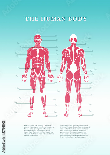 no people, bod, muscle, illustration, anatomy, human, white background, biology, science, three-dimensional, computer graphic, text, red, standing, diagram, backview, front view, poster