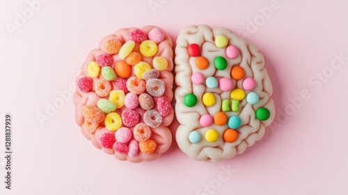 Human brain made of colorful candies. Sugar addiction, risks like diabetes and hyperactivity in children and adult