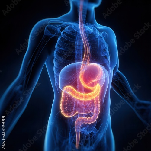 Human digestive system illustrated with vibrant colors showcasing organs and functionality in a scientific representation