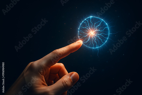 Human finger touching glowing electric plasma ball sphere representing energy power science electricity and futuristic digital interaction concept