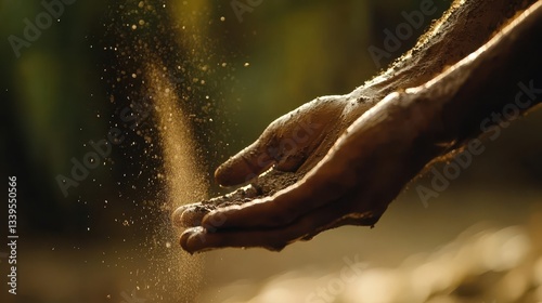 hand, dirt, dirtied, earth, ground, particle, grain, sand, dust, falling, dropping, spilling, release, texture, rough, skin, gesture, holding, cupped, palm, finger, sunlight, light, shadow, natural, organic, nature, closeup, detail, warm, colours, sharpened, macro, abstract, background, blur, soft, gold, brown, motion, movement, flowing, life, creation, touch, clean, gritty