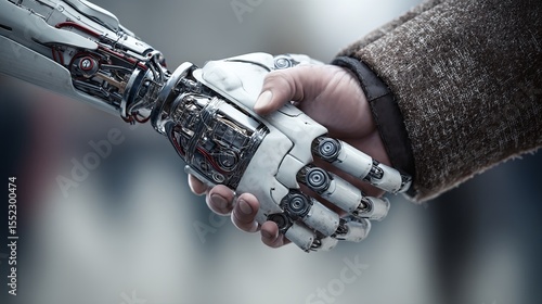 Human Handshaking Robotic Arm Futuristic Technology Advanced Mechanical Engineering Artificial Intelligence Digital Innovation Modern Design Science Fiction White Grey Metal