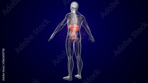Human kidney urinary system anatomy in red colour. 3d illustrations