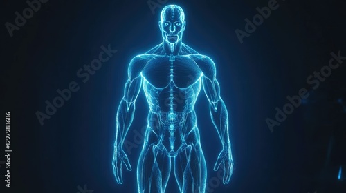 Human muscular system glowing in blue neon, futuristic medical visualization.