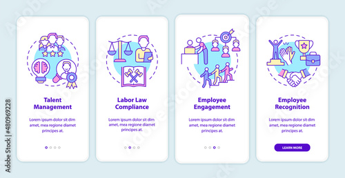 Human resources manager duties onboarding mobile app screen. Walkthrough 4 steps graphic instructions pages with linear concepts. UI, UX, GUI template. Myriad Pro-Bold, Regular fonts used