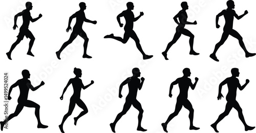 human, running, silhouette, set, white, background, collection, various, position, vector, athlete, sport, fitness, marathon, race, speed, exercise, physical exercise, motion, action, active, movement, shadow, outline, minimal, simple, flat, design, icon, graphic, illustration, poster, banner, flier, logotype, card, wallpaper, art, black, figure
