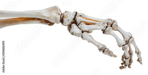 Human skeletal hand viewed from the side in detail, cut out - stock png.