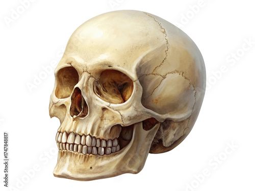 skull, human, anatomy, bone, skeleton, skull, medicals, education, science, biology, forensic, isolated, transparent, background, teethed, jawbone, lower jaw, temporal, frontal, occipital, nasal, orbital, cavity, suture, realistic, detailed, illustration, diagram, drawing, side, view, profile, head, android, structure, ancient, history, research, study