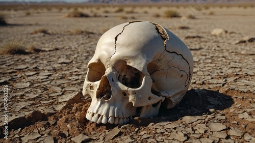 Human skull on Land with dry and cracked ground Desert Global warming background.