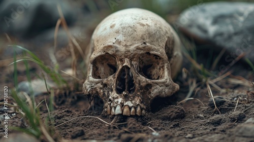 Human skull on the ground in real decomposition with good lighting in high resolution and quality. corpse concept