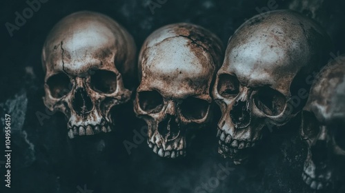 Human skulls and bones in dark underground burial, dimly lit, eerie atmosphere of historic cemetery