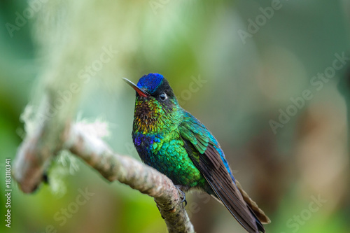spectacular, animal, birding, beak, beauty, bird, branch, front view, red, blue, green, colours, feather, garden, hummingbird, nature, standing, tree, wildlife, wing, closeup, whole, entire, blurred background, copy space