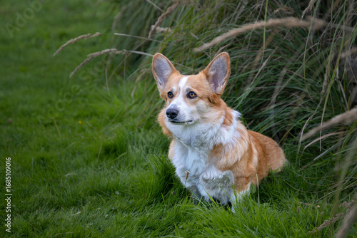 Hund der Rasse Pembroke Welsh Corgi sitzt im Gras.