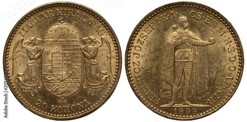 Hungary Hungarian coin 20 twenty korona 1898, crowned arms shield flanked by angels, Emperor Franz Joseph in Hungarian dress, gold,