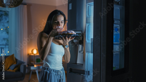 Hungry Beautiful Young Woman in the Kitchen in the Evening Opened the Fridge, Takes out a Piece of a Delicious Creamy Cake and Starting to East it. She Feels Satisfied.