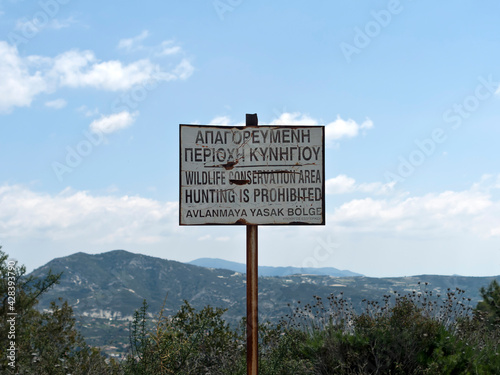 signboard, signs, note, hunting, prohibition, forbidden, wildlife, conservation, area, mountain, nature, environment, english, greek, turkish, cyprus, sky, scenic, panorama, no people