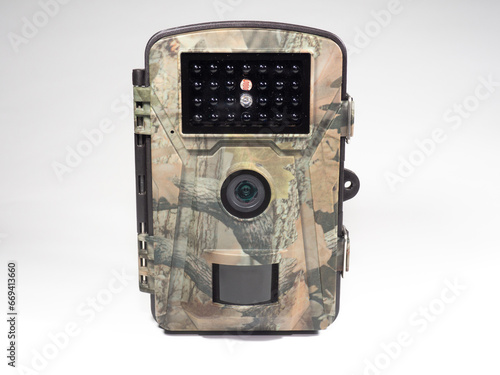 Hunting trail camera. Outdoor wildlife surveillance camera with motion detector. Nature protection and monitoring