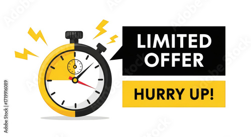 clock, stopwatch, time, timer, hurry, offer, limited, sale, deadline, promotion, reminder, urgent, countdown, alarm, fast, discount, advertisement, marketing, deal, bargain, yellow, black, lightning, speed, efficiency, notification