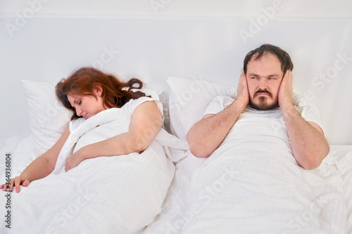 Husband plugs ears with hands due to noise and snoring of sleeping wife. Family relationships in isolation due to coronavirus.