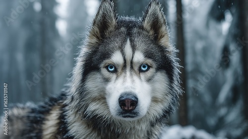 Husky with bright blue eyes standing in snowy forest, frosty air, dramatic winter light, ultra realistic fur texture, cinematic composition, professional outdoor photo, award-winning quality
