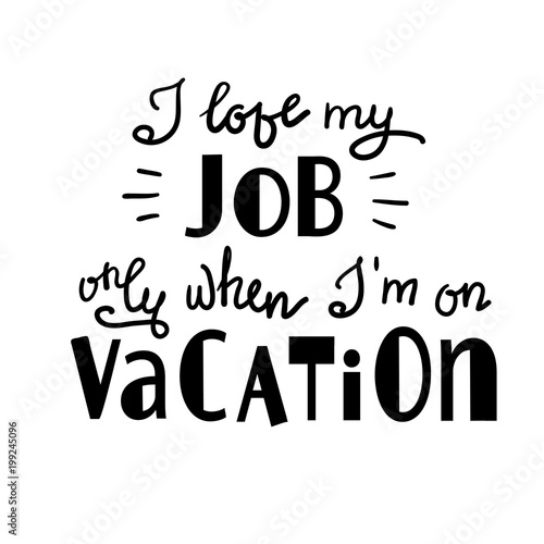 I love my job only when I am on vacation - funny handwritten motivational quote. Print for inspiring poster, t-shirt, bag, logo, greeting postcard, flyer, sticker, sweatshirt, cups. Simple vector sign