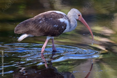 Ibis juvenile bird wading in water